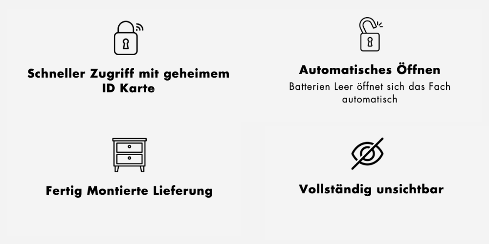 Das Schloss kann man von außen nicht erkennen, sodass Ihr neues Sicherheitsmöbel - gerade in Kombination mit einem anderen Möbeln - in Ihrer Wohnung komplett unauffällig bleibt!